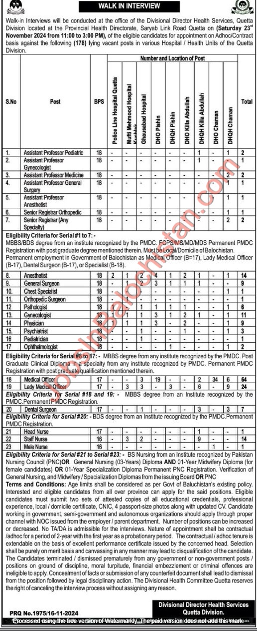 Applications must bring their documents during the walk-in interview at the office of the Divisional Director Health Service, Quetta Division located at the Provincial Health Directorate, Saryab Link Road Quetta on Saturday 23 Nov 2024.