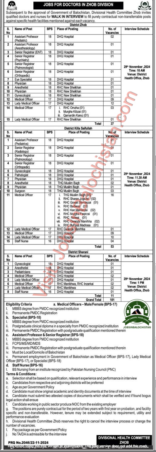 - Bring your documents with your at the location of District Health Office in Zhob on 29th Nov 2024. Interviews will be held according to the schedule provided.