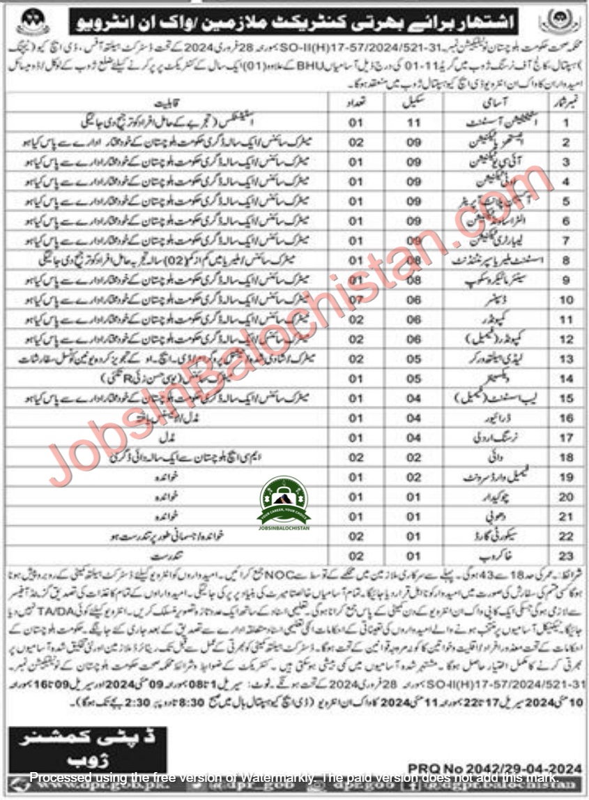 Department of Health Government of Balochistan No. No. 31-57/2024/521-17 11-50 Maurya 28th February 2024 under District Health Office, DHQ (Neching Hospital College of Zhengzhou) for the following posts of grade 11-101 of BHU Also (01) Walk-in interview of Local Domicile candidates of District Zhob will be held at DHQ Hospital Zhob for filling on one year contract.