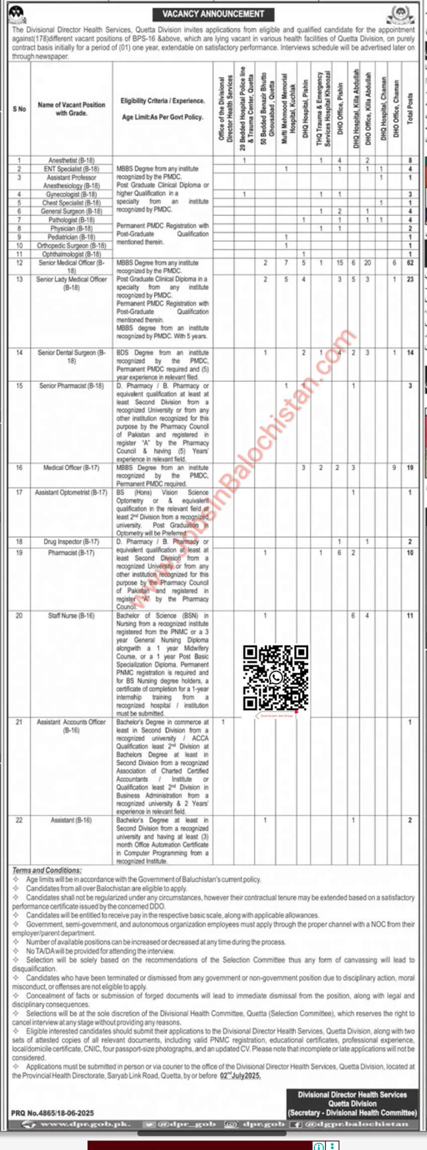 - Applications must be submitted to the Divisional Director Health Services, Quetta Division before 02 July 2025.