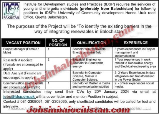 Institute for Development studies and Practices (IDSP) requires the services of young and energetic individuals (preferably from Balochistan) for following positions in IDSP’s University of Community development Hanna Urak road Office, Quetta Balochistan.
