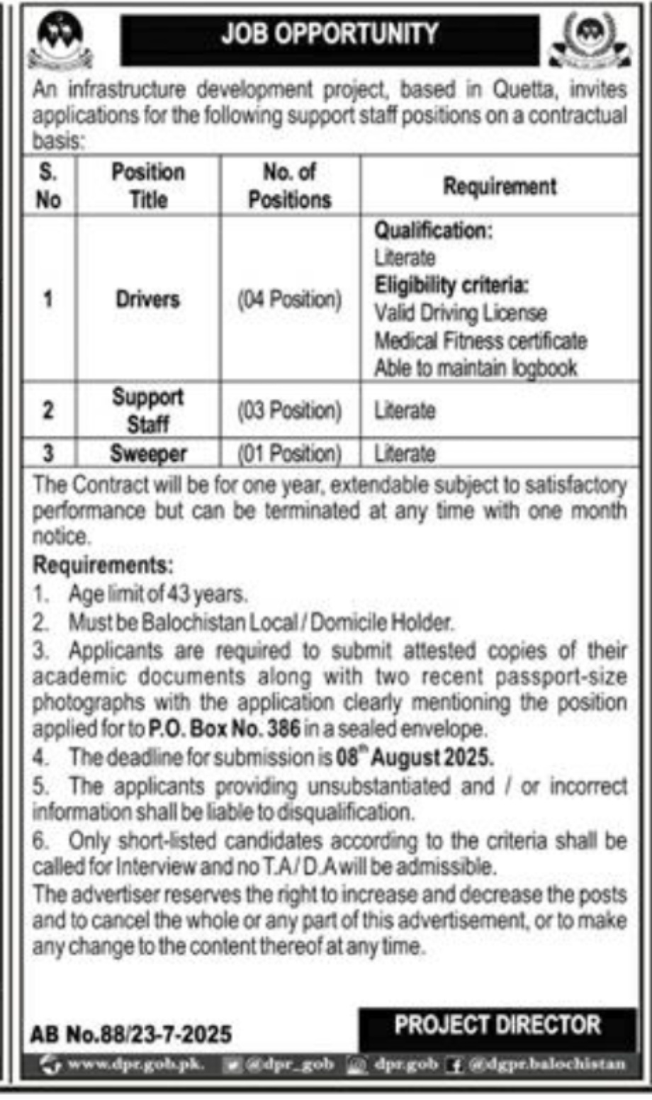 Infrastructure Development Project Quetta Balochistan jobs for 2025. These vacancies have been published in the Local Newspaper and are open to eligible candidates from Balochistan. The hiring process will adhere to departmental policies to ensure fairness and transparency. If you meet the eligibility criteria, you can apply for the positions listed in the advertisement below.