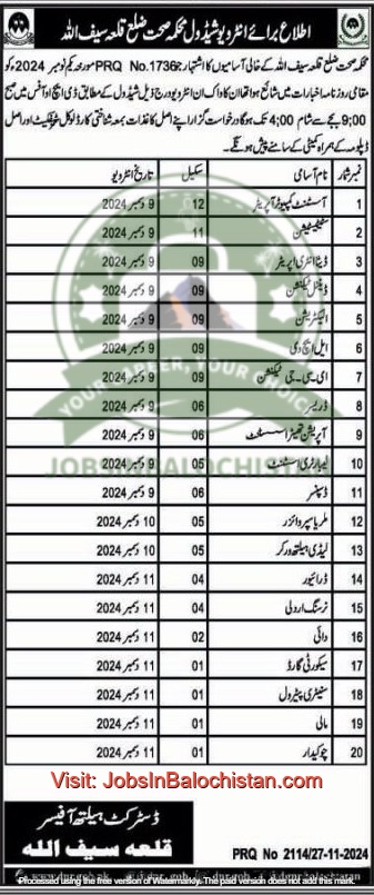 The Health Department walkin & interview call for District Killa Saifullah Jobs in Balochistan 2024 has started the vacancy process for the candidates. Therefore, all such relatives who have submitted their applications for the vacancies should attend the interview for the following schedule according to their educational qualifications and eligibility and with the required DocumentsÂ