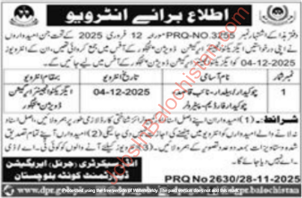 Candidates who have applied for Irrigation Department Balochistan View Full Job Advertisement (PRQ 3255/12-02-2025)Â for following vacancies in Makran Division, District Punjgoor Balochistan, is hereby informed that their interview call, Jobs In Balochistan will be conducted according to the following schedule: