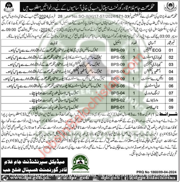 Date of submission of applications and walk-in interview is 23rd April 2024 at 09:00 AM. 2 PM till 03:00 PM, submit your applications at Jam Ghulam Qadir Government Hospital Jab Admin Branch and no candidate will be accepted after the mentioned date.