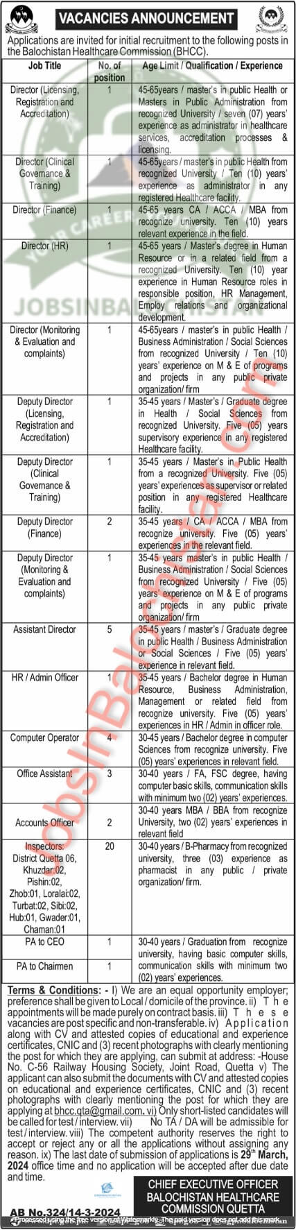 Applications are being accepted for the positions of director accreditation, director registration, accounts officer, computer operator, assistant director, HR officer, deputy director finance, director evaluations, deputy director monitoring, director complaints, director monitoring, director clinical governance, inspector, director hr, deputy director licensing, deputy director clinical governance, director training, personal assistant, deputy director, pa, director training, office assistant, and admin officer in Quetta, hub, khuzdar, zhob, turbat, pishin, chaman, gwadar, quetta, loralai, and sibi Balochistan, Pakistan. Required educational backgrounds include CA, BBA, M.sc., ACCA, MS, Intermediate, DAE, Master, Bachelor, BA, B Pharmacy, and MBA, among others.
