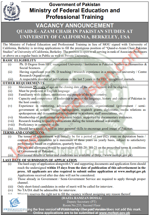 Looking for a prestigious academic opportunity? Check out the latest vacancy announcement for the ‘Quaid-e-Azam Chair in Pakistan Studies’ at the University of California, Berkeley, USA, sponsored by the Government of Pakistan Ministry of Federal Education and Professional Training.