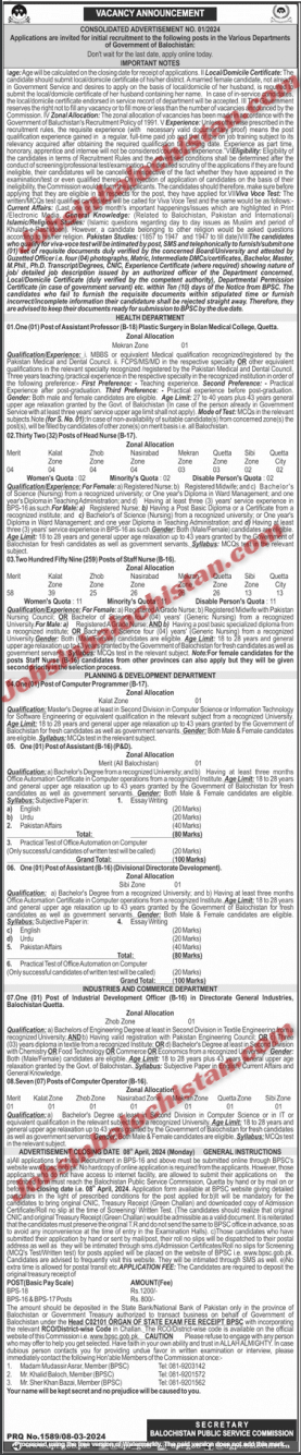 All applications for Initial Recruitment in BPS-16 and above must be submitted online through BPSC website www.bpsc.gob.pk. No hardcopy of online application is required from the applicants. However, those applicants who do not have access to internet facility, are allowed to submit their applications on the prescribed form must reach the Balochistan Public Service Commission, Quetta by hand or by mail on before the closing date ie. 08 April, 2024.