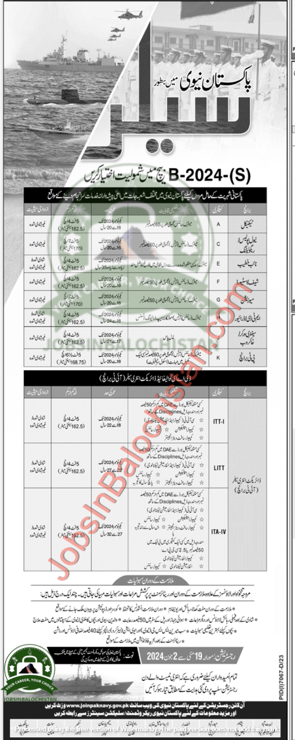 Pakistan Navy jobs in Balochistan. The vacancies have been announced in Balochistan through the official website www.joinpaknavy.gov.pk The hiring process will follow departmental guidelines. Candidates from Balochistan who satisfy the requirements can now apply for the vacancies that are listed in the advertisement. After the recruitment process is complete, eligible applicants can apply using the organizationβs established procedure and receive these Jobs in Balochistan in 2024