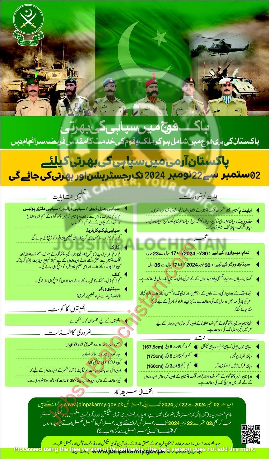 The Pakistan Army is calling upon the brave and dedicated youth of Pakistan to join its ranks as soldiers. This is an opportunity to serve the nation with pride and honor. The recruitment process is open from September 2, 2024, to November 22, 2024. Aspiring candidates from Balochistan and other regions can apply for various positions including General Duty Soldier, Military Police, Clerk, and Cook.