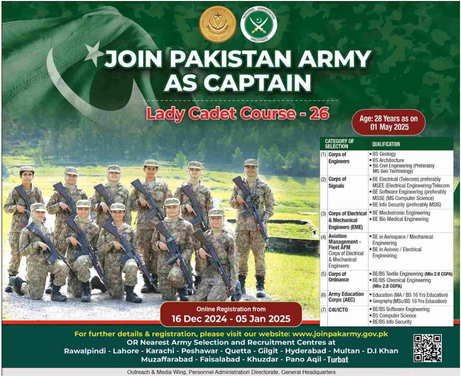 Pakistan Army Jobs: Join As Captain Lady Cadet Course – 26. The ground service branch and largest unit of the Pakistan Armed Forces is the Pakistan Army, also referred to as the Pak Army. The army’s ultimate commander is Pakistan’s president. The army is commanded by a four-star general as the Chief of Army Staff.