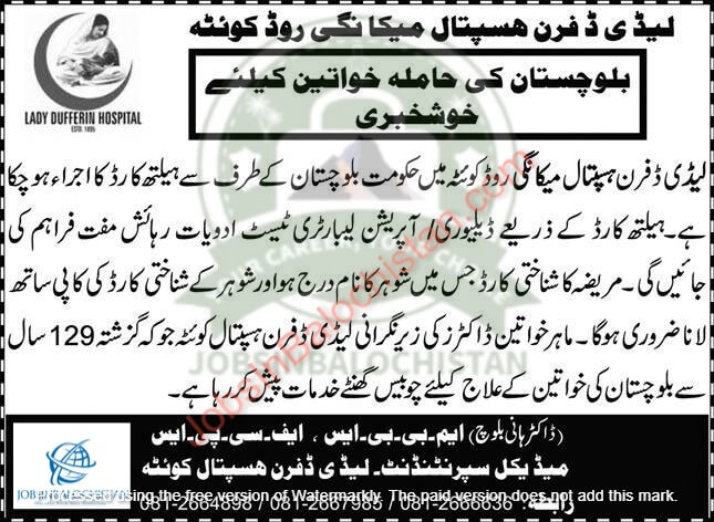 In Lady Differn Hospital, Mekangi Road Quetta health card has been issued by Government of Balochistan through health card delivery / operation laboratory test medicine accommodation provided free of chargeĀ