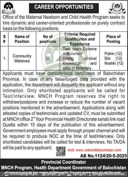 Health Department. Maternal Newborn and Child Health MNCH program Balochistan jobs for 2025. These vacancies have been published in the Local Newspaper and are open to eligible candidates from Balochistan. The hiring process will adhere to departmental policies to ensure fairness and transparency. If you meet the eligibility criteria, you can apply for the positions listed in the advertisement below.
