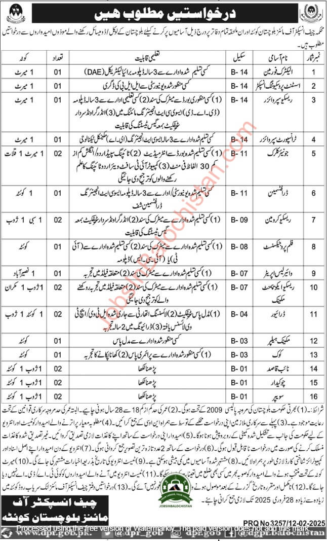 Mines Balochistan jobs for 2025. These vacancies have been published in the Local Newspaper and are open to eligible candidates from Balochistan. The hiring process will adhere to departmental policies to ensure fairness and transparency. If you meet the eligibility criteria, you can apply for the positions listed in the advertisement below.