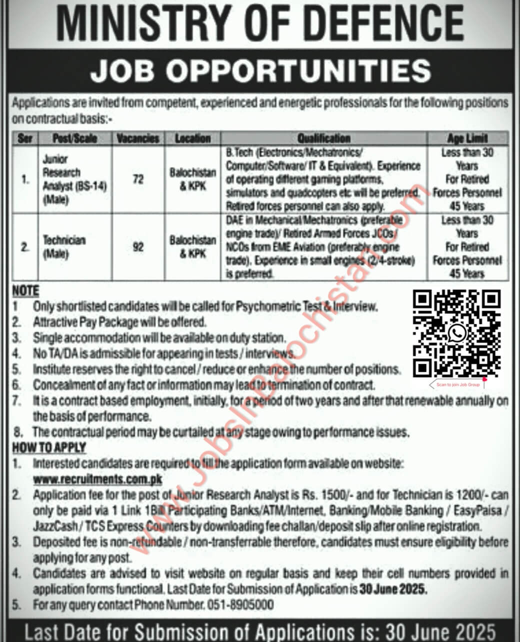 Ministry of Defence announced new Balochistan jobs for 2025. These vacancies have been published in the Local Newspaper and are open to eligible candidates from Balochistan. The hiring process will adhere to departmental policies to ensure fairness and transparency. If you meet the eligibility criteria, you can apply for the positions listed in the advertisement below.