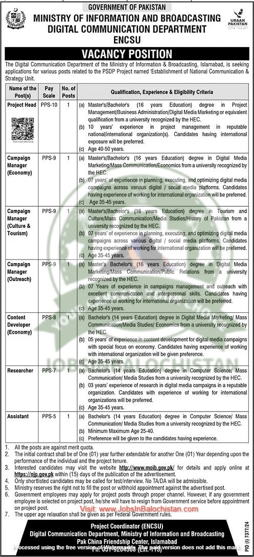 Ministry of Information & Broadcasting PSDP named “Establishment of Natonal Communication & Streategy Unit announced new jobs for 2025. These vacancies have been published in the Jang Newspaper and are open to eligible candidates from Balochistan. The hiring process will adhere to departmental policies to ensure fairness and transparency. If you meet the eligibility criteria, you can apply for the positions listed in the advertisement below.