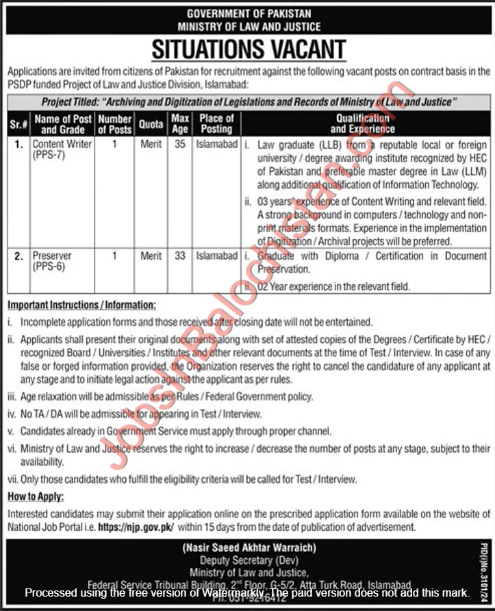 Ministry of Law and Justice has jobs in Balochistan 2024. The vacancies have been announced in Balochistan through the Local Newspaper. The hiring process will follow departmental guidelines. Candidates from Balochistan who satisfy the requirements can now apply for the vacancies that are listed in the advertisement.