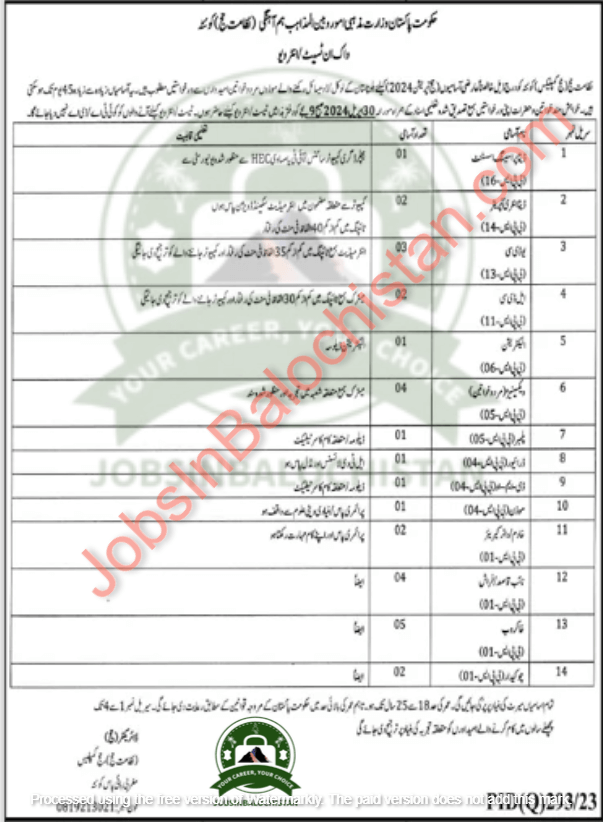 ministry of religious affairs and interfaith harmony Jobs Balochistan