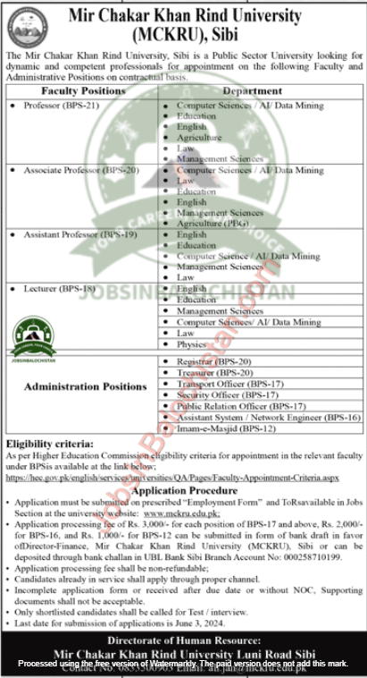 The Mir Chakar Khan Rind University, Sibi is a Public Sector University looking for dynamic and competent professionals for appointment on the following Faculty and Administrative Positions on contractual basis.