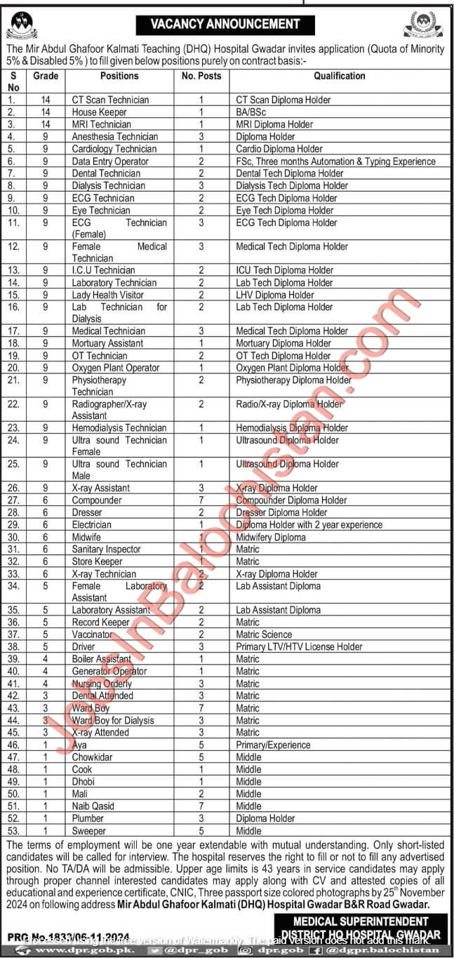 - Applications must be submitted to the Mir Abdul Ghafoor Kalmati Hospitan Gwadar before 25 Nov 2024. Interviews will be held according to the schedule provided.