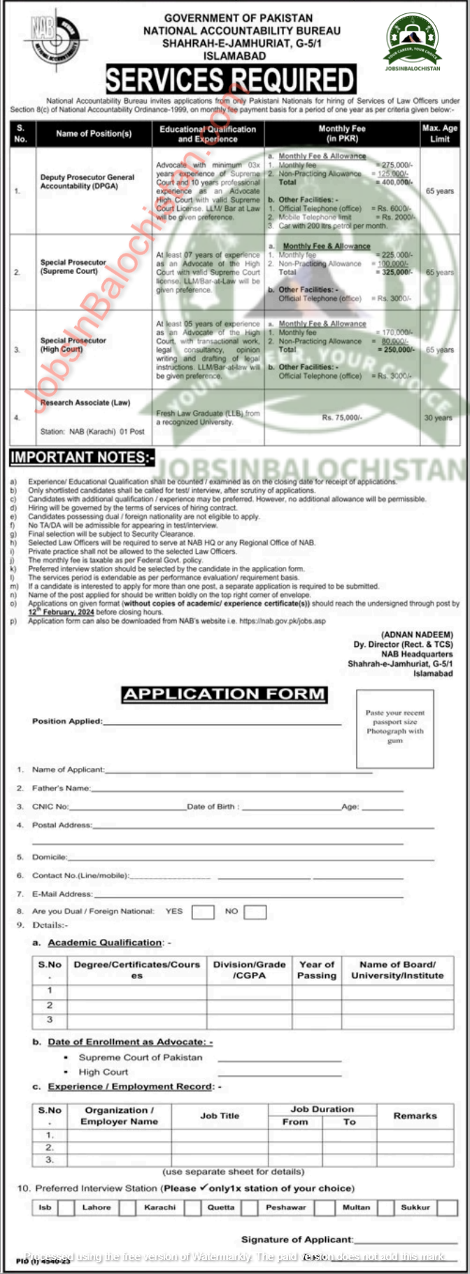 through post by 12th February, 2024 before closing hours. - Application form can also be downloaded from NAB’s website i.e. https://nab.gov.pk/jobs.asp