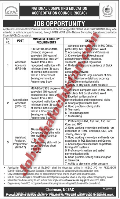 Application processing fee of Rs.500/- shall be deposited online in NCEAC A/C No. PK93ASCM 0001810380006510 Askari Bank Ltd. Fee receipt must be uploaded with the application form Only shortlisted candidates shall be called for interviews and no TA DA shall be admissible. NCEAC reserves the right to cancel the recruitment process in part or whole at any stage without assigning any son Interested candidates may fill and submit their applications at www.nceac.org.pk till March 20, 2024 Degrees only from HEC recognized universities degree awarding institutions will be considered.
