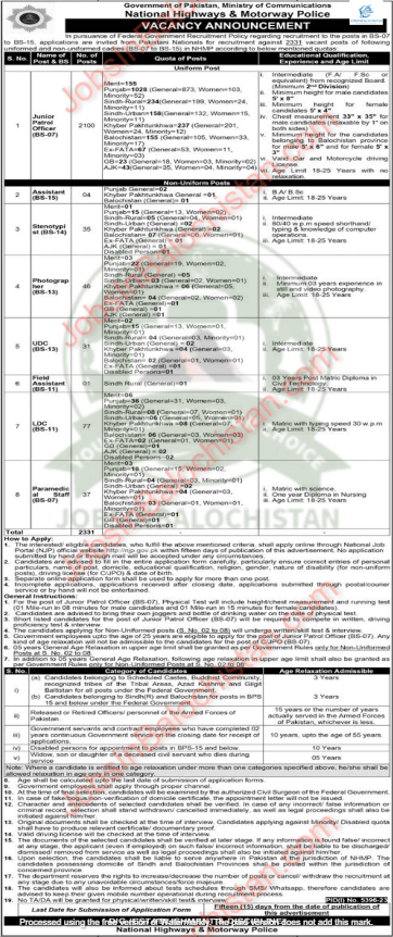 Are you seeking exciting career opportunities in the public sector? Look no further! The National Highways Motorway Police (NHMP), under the Government of Pakistan Ministry of Communications, has announced 2331 vacancies for various uniformed and non-uniformed cadres (BS-07 to BS-15) in compliance with the Federal Government Recruitment Policy. Here’s everything you need to know about these coveted positions: