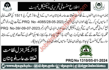 Candidates who have submitted their applications under PRQ No. 2023-05-4085/28 PRQ No. PRQ No. 2023-05-4085/28 to fill up various vacant posts of grades 1 to 15 in Balochistan Public Relations and its subsidiary offices. -07-2023 and whose written veterinary certificates were taken under the Department’s newspaper advertisement no. While these vacancies will be re-advertised soon.