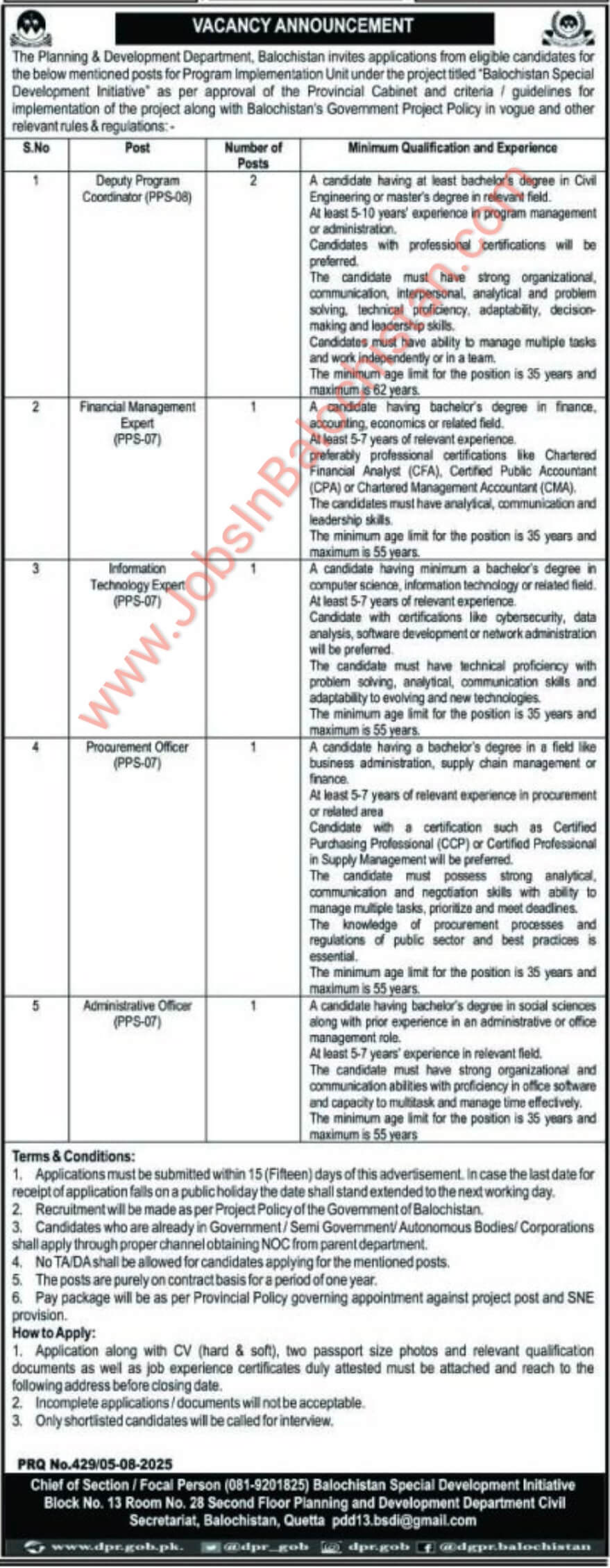 Planning and Development department, Balochistan under project jobs for 2025. These vacancies have been published in the Local Newspaper and are open to eligible candidates from Balochistan. The hiring process will adhere to departmental policies to ensure fairness and transparency. If you meet the eligibility criteria, you can apply for the positions listed in the advertisement below.