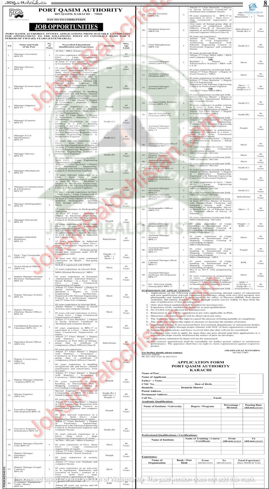 - 1. Applications on the following prescribed form enclosing attested copies of educational and post qualification relevant experience certificates, along with two (02) passport size photographs and detailed CV must reach to the office of Director (HRM). Port Qasim Authority. Bin Qasim, Karachi – 75020, through courier service within 15 days from the date of publication of this advertisement.