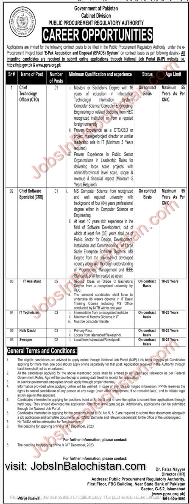 Applications are invited for the following contract posts to be filled in the Public Procurement Regulatory Authority under the e- Procurement Project titled “E-Pak Acquisition and Disposal (EPADS) System” on contract basis as per following details:- All intending candidates are required to submit online applications through National Job Portal (NJP) website Le https://njp.gov.pk & www.ppra.org.pk