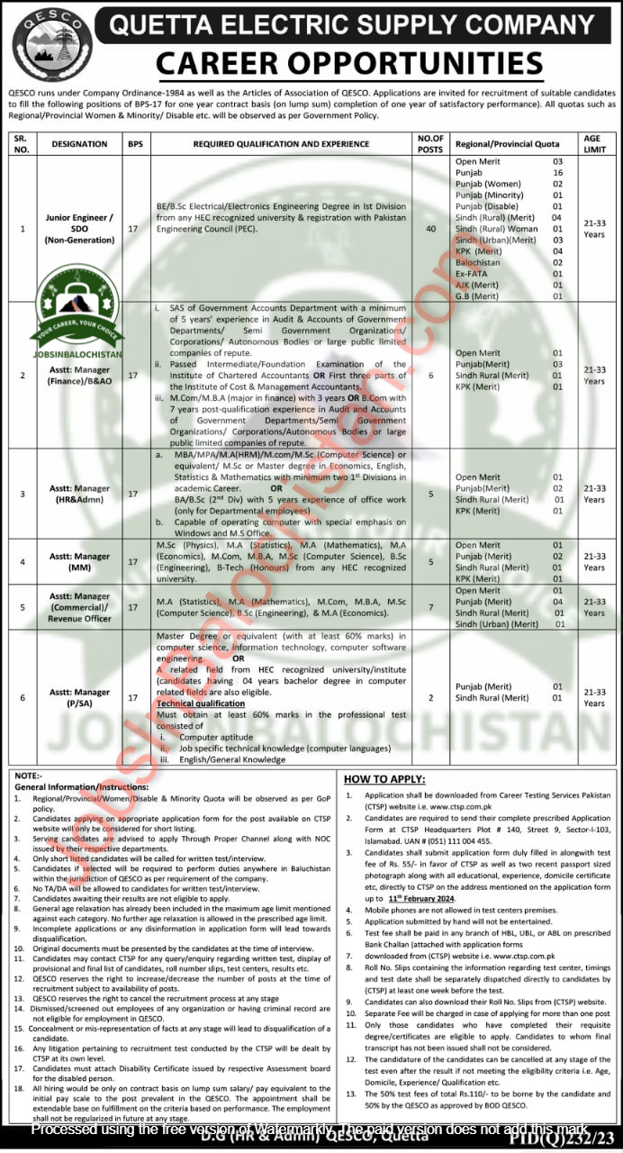 QESCO runs under Company Ordinance-1984 as well as the Articles of Association of QESCO. Applications are invited for recruitment of suitable candidates to fill the following positions of BPS-17 for one year contract basis (on lump sum) completion of one year of satisfactory performance). All quotas such as Regional/Provincial Women & Minority/ Disable etc. will be observed as per Government Policy.