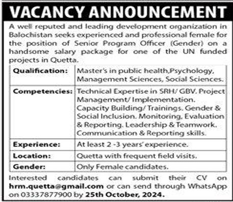 A well reouted and leading development organization in Balochistan seeks experienced and professional female for the position of Senior Program Officer (Gender) on a handsome salary package for one of the UN funded projects in Quetta.