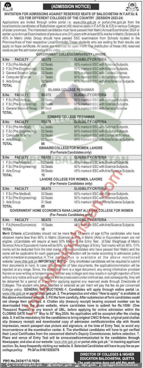INVITATION FOR ADMISSIONS AGAINST RESERVED SEATS OF BALOCHISTAN IN F.A/F.Sc & ICS FOR DIFFERENT COLLEGES OF THE COUNTRY (SESSION 2023-24)
