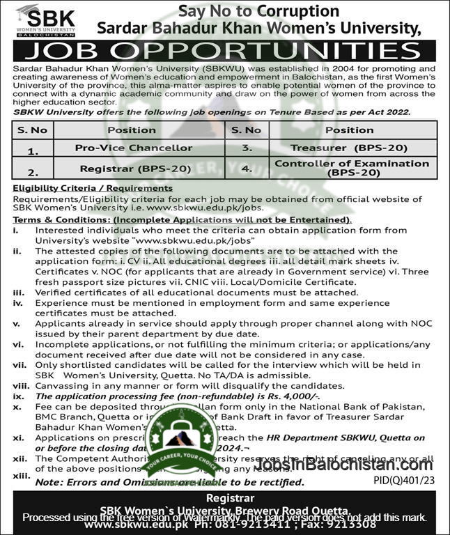 University’s website “www.sbkwu.edu.pk/jobs“ - The attested copies of the following documents are to be attached with the application form: i. CV ii. All educational degrees iii. all detail mark sheets iv. Certificates v. NOC (for applicants that are already in Government service) vi. Three