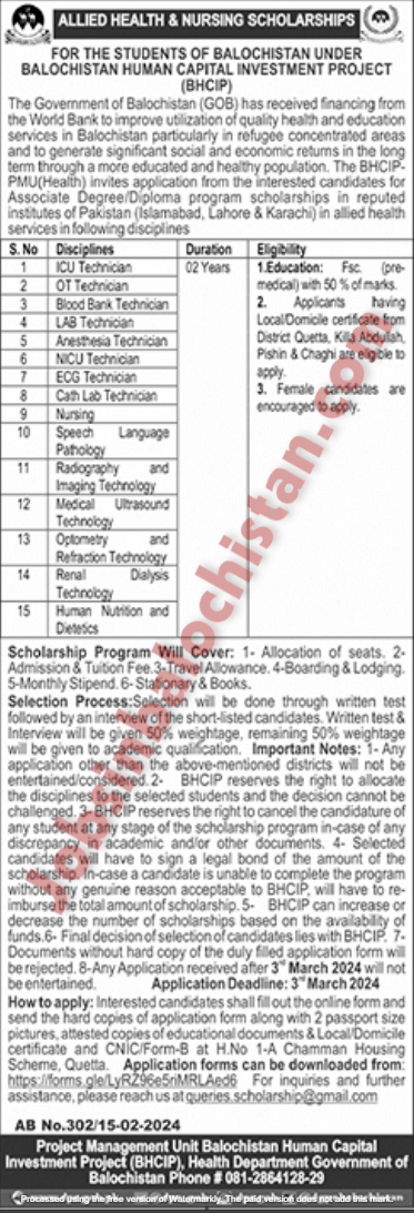 The Government of Balochistan (GOB) has received financing from the World Bank to improve utilization of quality health and education services in Balochistan particularly in refugee concentrated areas and to generate significant social and economic returns in the long term through a more educated and healthy population. The BHCIP PMU (Health) invites application from the interested candidates for Associate Degree/Diploma program scholarships in reputed institutes of Pakistan (Islamabad, Lahore & Karachi) in allied health services in following disciplines.