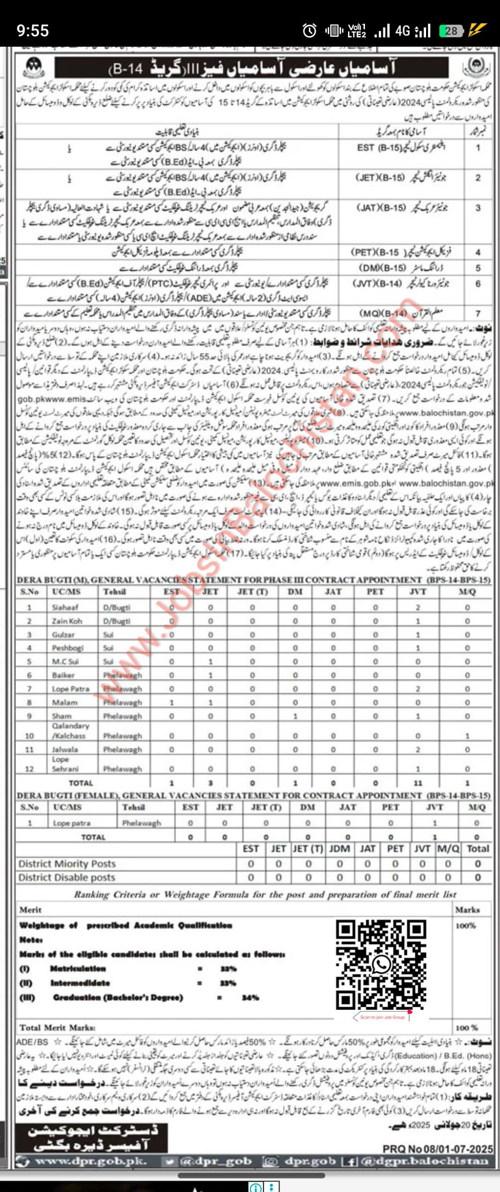 The Education Department of District Dera Bughti, Balochistan, invites applications for various teaching jobs in schools across the district UC. These posts are temporary, (may extendable permanent) and candidates from Dera Bughti are encouraged to apply. Applicants must meet the required educational qualifications and eligibility criteria to be considered for these roles.