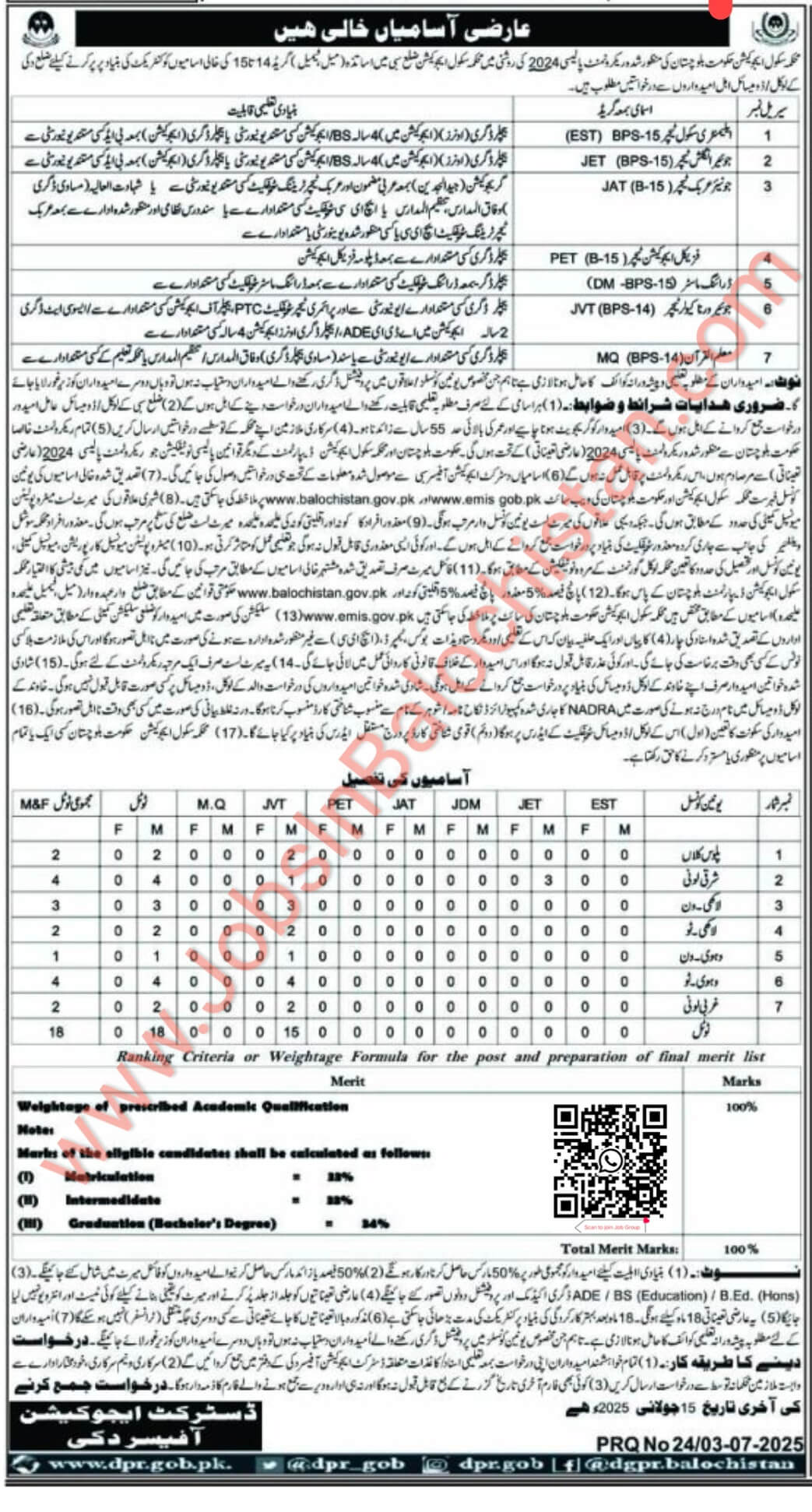 1- elementary school teacher 2- Junior English Teacher 3- Junior Arabic Teacher 4- Drawing Master 5- Physical Education Teacher 6- Junior Vernacular Teacher JVT – BPS-14 7- Muhallamum Quran