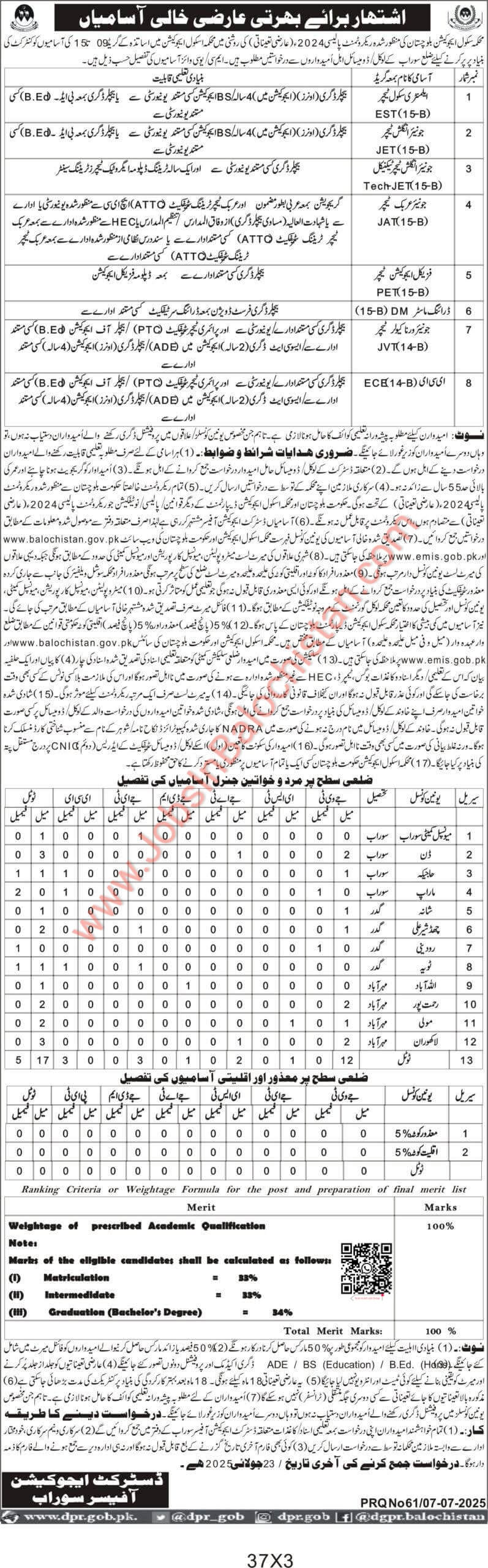 The Education Department of District Surab, Balochistan, invites applications for various teaching jobs in schools across the district UC. These posts are temporary, (may extendable permanent) and candidates from Sohbatpur are encouraged to apply. Applicants must meet the required educational qualifications and eligibility criteria to be considered for these roles.