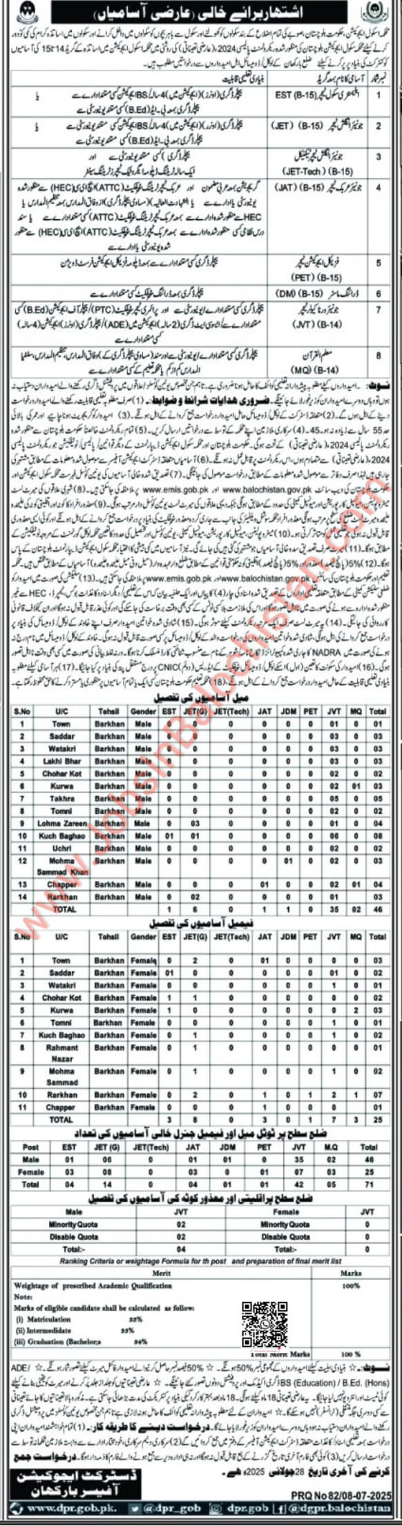 The Education Department of District Barkan, Balochistan, invites applications for various teaching jobs in schools across the district UC. These posts are temporary, (may extendable permanent) and candidates from Barkan are encouraged to apply. Applicants must meet the required educational qualifications and eligibility criteria to be considered for these roles.