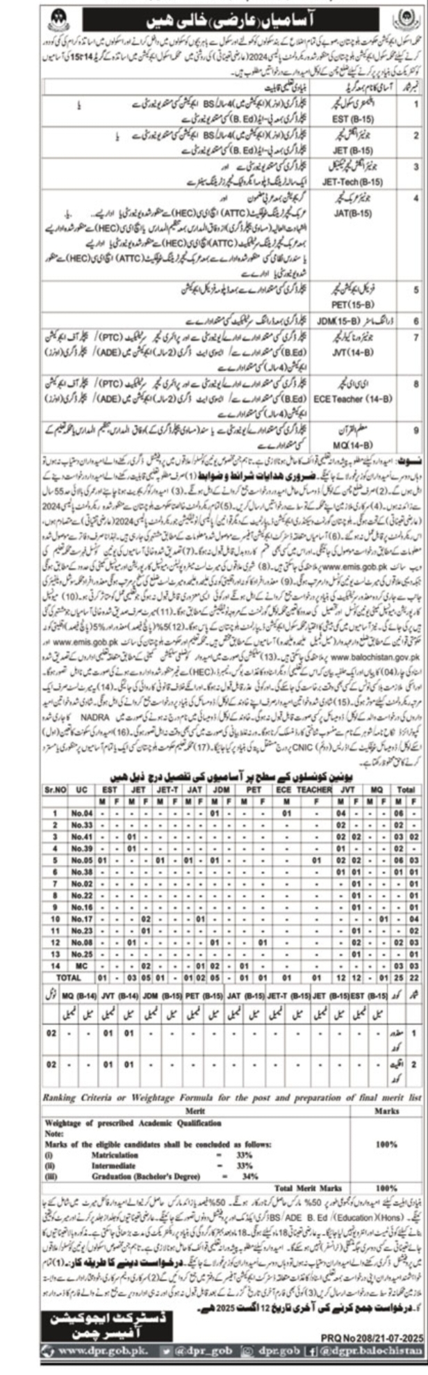 1- Elementary School Teacher 2-Junior English Teacher 3- Junior English Teacher Technical 4- Junior Arabic Teacher 5- Physical Education Teacher 6- Drawing Master 7- Junior Vernacular Teacher JVT – BPS-14 8-ECE Teacher 9- Muhallium Quraan
