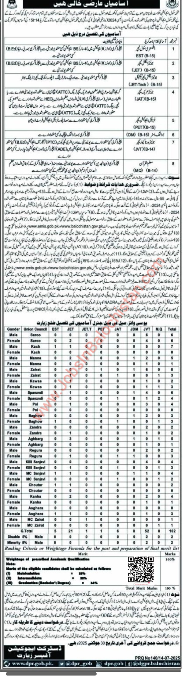 1- Elementary School Teacher 2-Junior English Teacher 3- Junior English Teacher Technical 4- Junior Arabic Teacher 5- Physical Education Teacher 6- Drawing Master 7- Junior Vernacular Teacher JVT – BPS-14 8- Muhallium Quraan