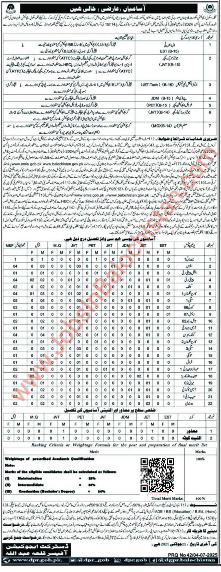 1- Elementary School Teacher 2-Junior English Teacher 3- Junior English Teacher Technical 4- Junior Arabic Teacher 5- Physical Education Teacher 6- Drawing Master 7- Junior Vernacular Teacher JVT – BPS-14 8- Muhallium Quraan