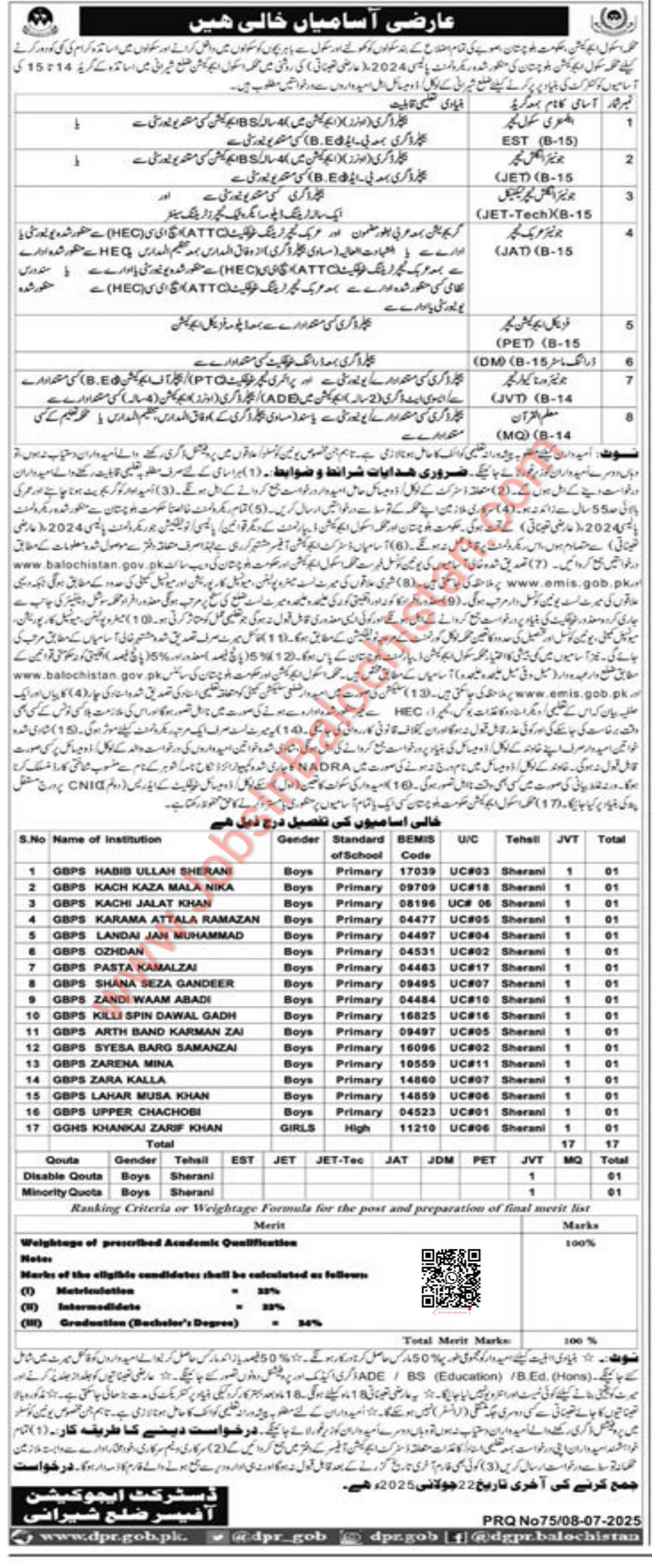 School Teaching Education Department Balochistan District Sheerani Jobs 2025
