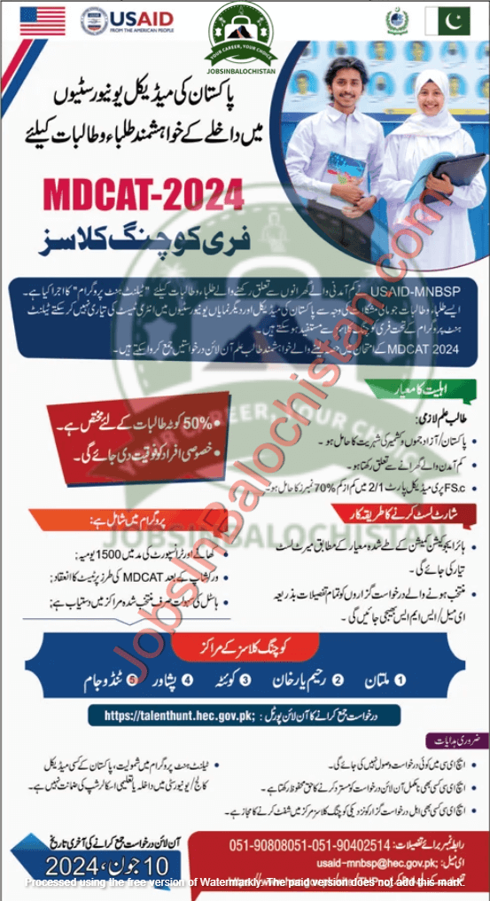 USAID-MNBSP has launched a “Talent Hunt Program” for students from low income families. Students who cannot prepare for the entrance test in medical and other prominent universities of Pakistan due to financial difficulties. One can benefit from free coaching classes under the HUNT program. 2024 MDCAT exam interested students can submit online applications..