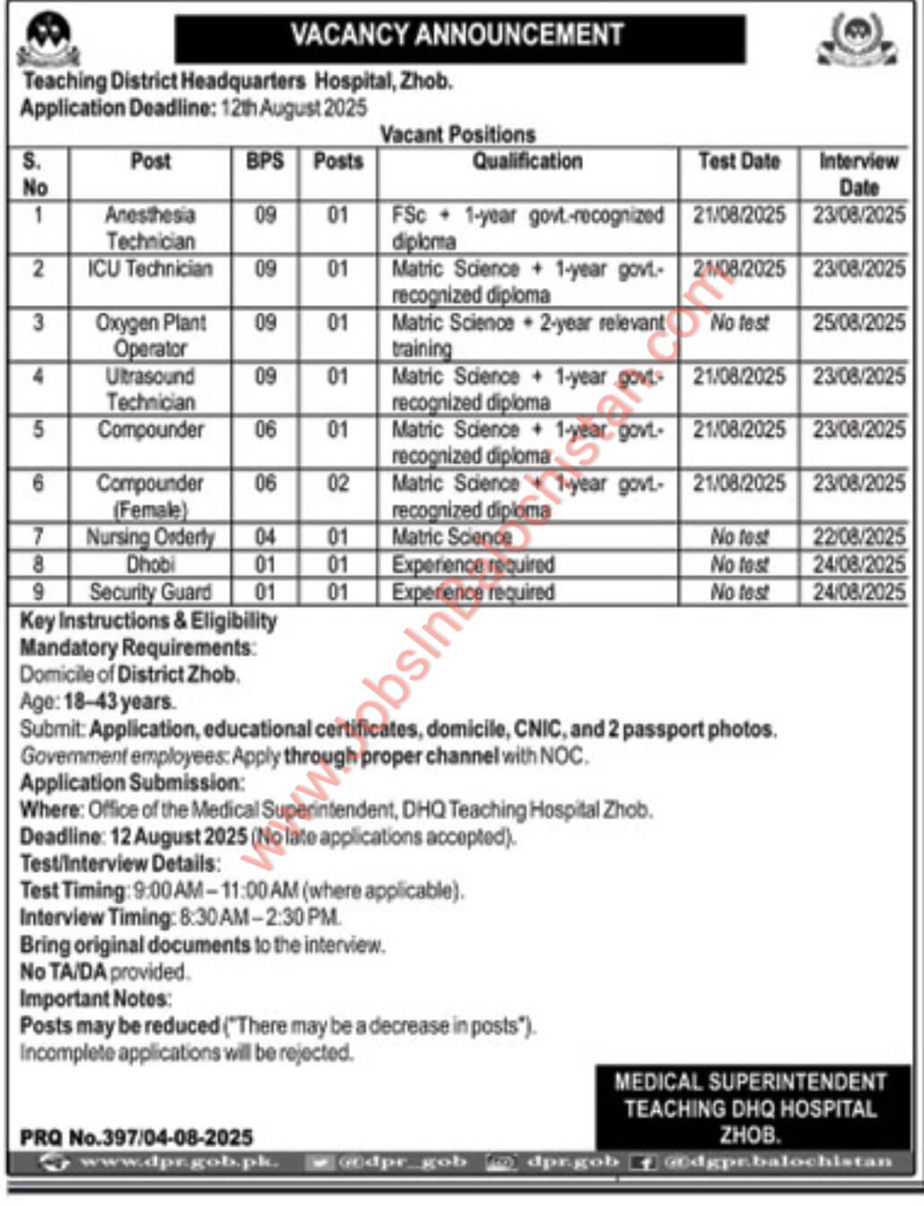- Send your documents to the office of 👉 Medical Superintindant, DHQ Teaching Hospital Zhob.