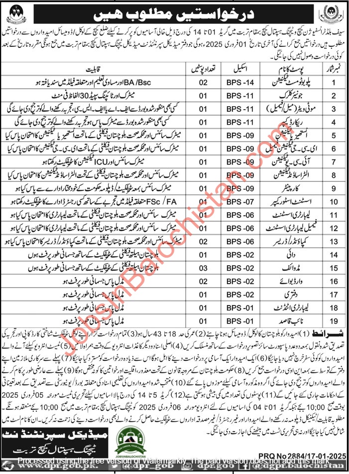- Applications must be submitted to the office of the Medical Superintendent Medical Teaching Hospital Kech TurbatΒ before 01 feb 2025.
