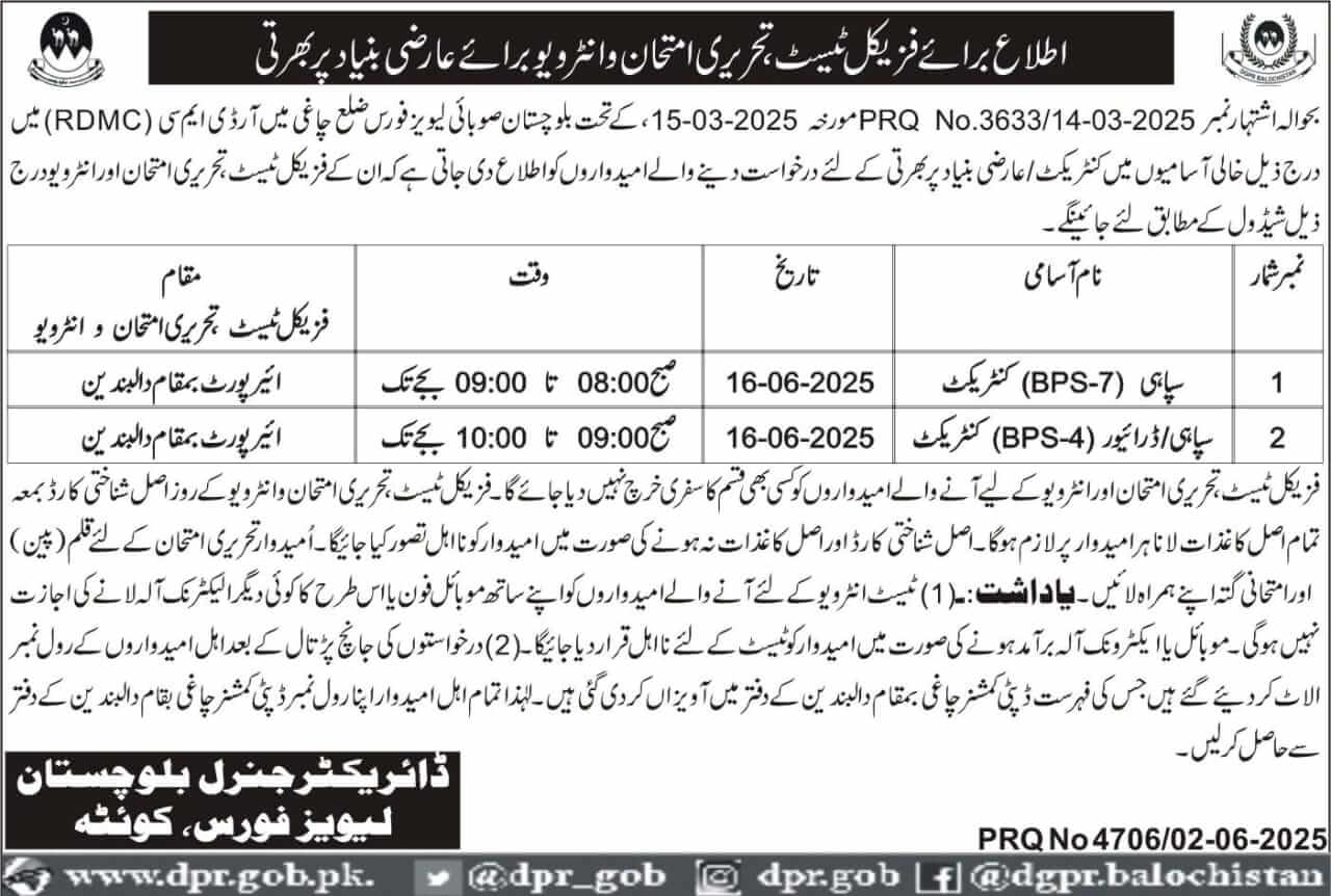 To the all male and female candidates who have submitted their application for Balochistan Levies Force District Chaghi jobs under advertisement reference PRQ No. 3733 Dated: 14-03-2025 are advised to join physical test (Running height and chest measurement) schedule stage in the Balochistan Levies Force District Chaghi recruitment process! Your dedication and commitment have brought you one step closer to joining the esteemed Balochistan constablulary.