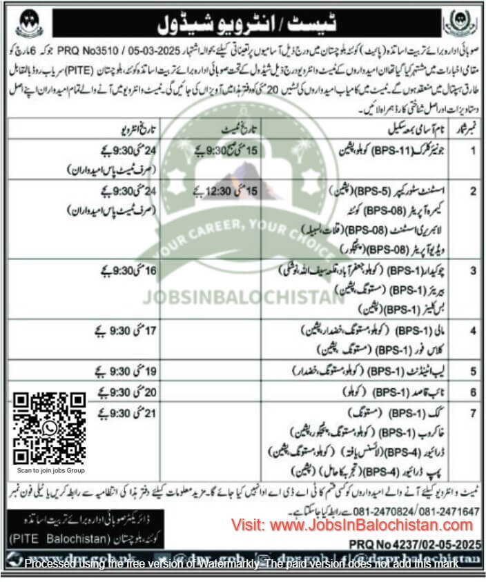 Candidates who have applied under advertisement no. PRQ 3510/05-03-2025 for following vacancies in Balochistan, is hereby informed that their Test and Interview call Jobs In Balochistan will be conducted according to the following schedule: