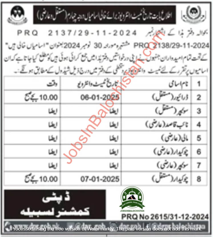 Candidates who have applied under advertisement no. PRQ 2137/29-11-2024 and PRQ 2138.29-11-2024 for following vacancies in District Lasbela Board of Revenue Department Balochistan, is hereby informed that their Test & Interview call Jobs In Balochistan will be conducted according to the following schedule: